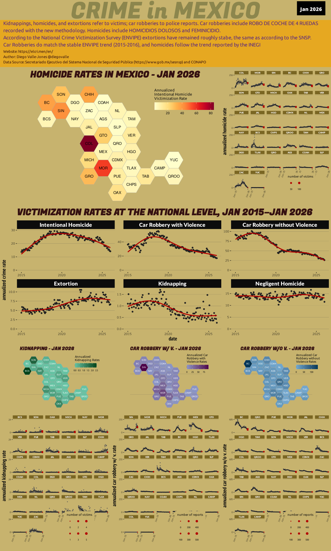 Each month the Secretariado Ejecutivo del Sistema Nacional de Seguridad Pública publishes information on crimes known to the police across all of Mexico on its website in the form of pdf tables and Excel files. This website downloads, processes the data, merges it with population data, and presents it as easy to interpret crime rates.